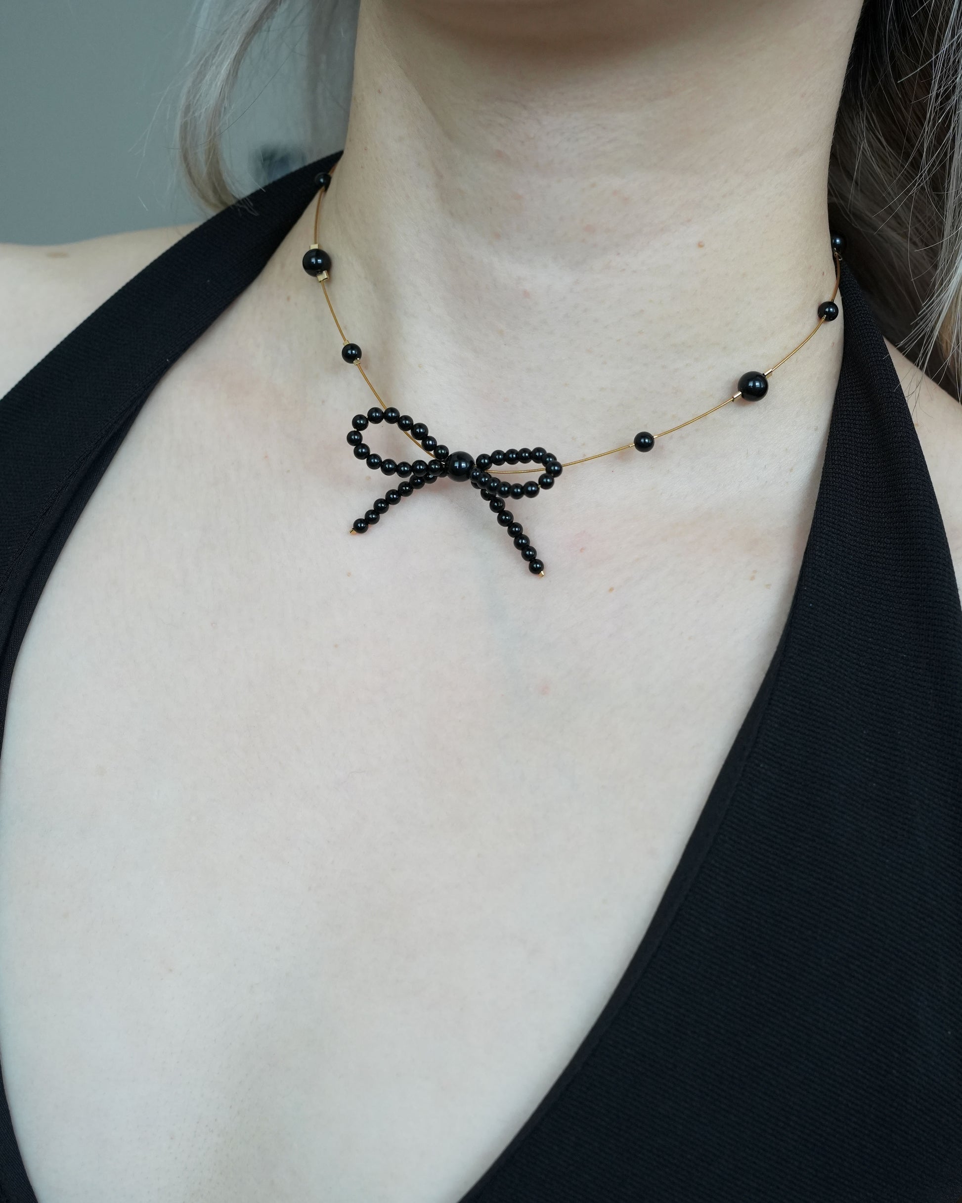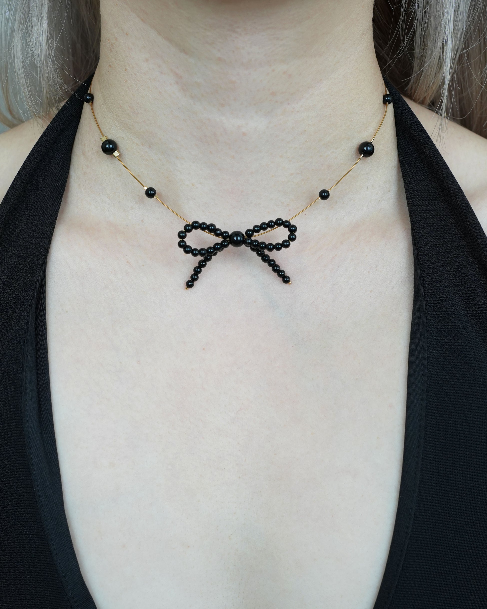 Like a bow-tied secret on your collarbone—this handcrafted necklace features floating black onyx beads and 14k gold-filled accents. Delicate, daring, and a little bit mischievous.